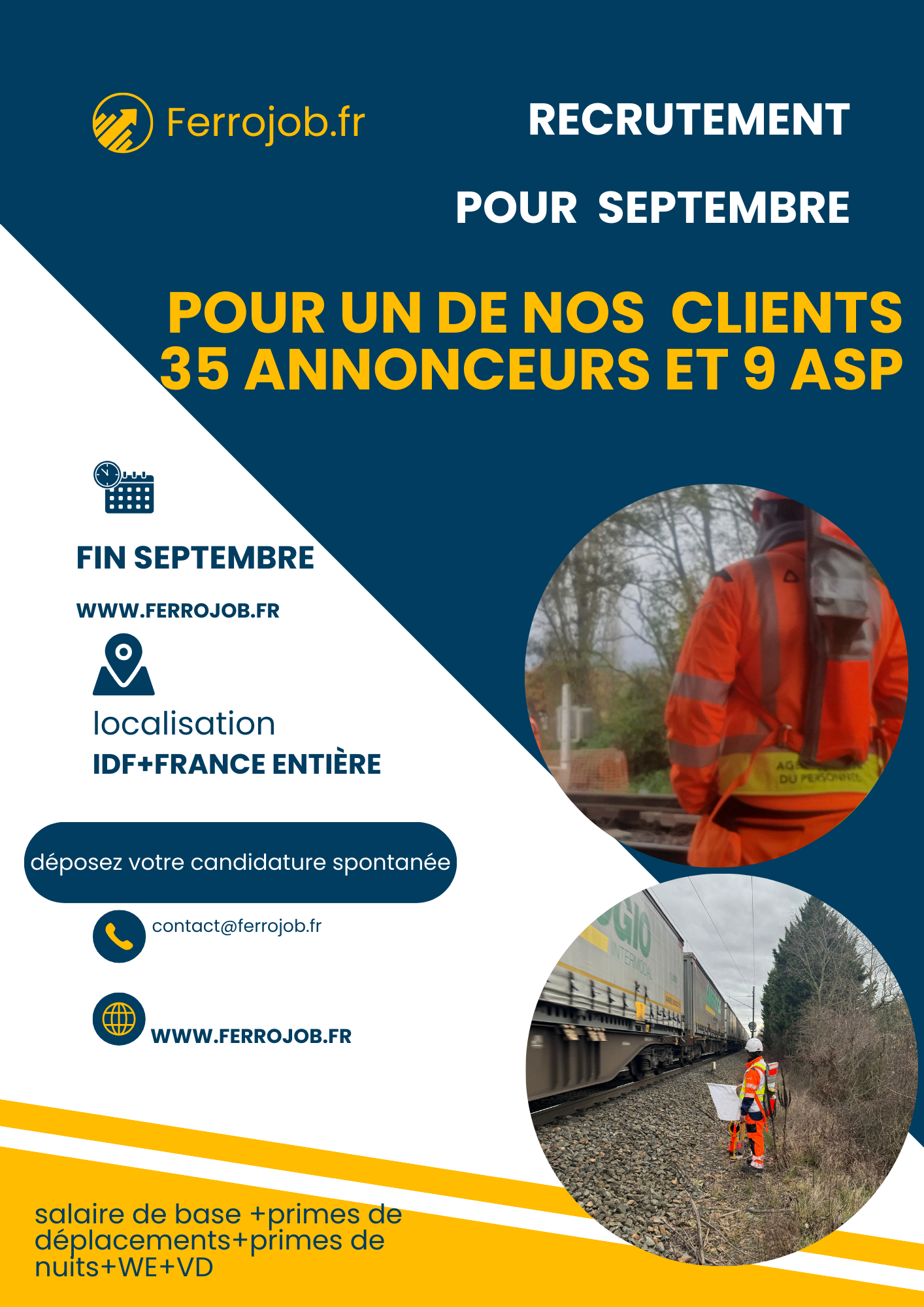 Nous recherchons 35 annonceurs-sentinelles pour nos chantiers ferroviaires. Vous aurez la responsabilité d'annoncer conformement et sous les directives de l'ASP les passages des circulations et de veiller à la sécurité des équipes sur le terrain. Vous assistez au briefing journalier.